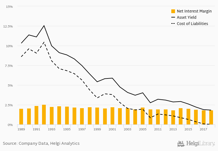 Historically, the bank’s net interest margin reached an all time high of 2.56% in 1992 and an all time low of 1.81% in 2018. The average margin in the last five years amounted to 1.93%.