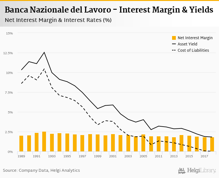 Banca Nazionale del Lavoro's net interest margin amounted to 1.81% in 2018, down from 1.82% compared to the previous year.