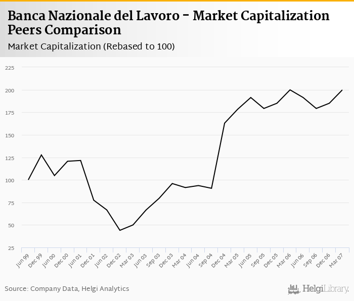 Banca Nazionale del Lavoro stock traded at EUR 2.92 per share at the end of first quarter of 2007 implying a market capitalization of USD 10,956 mil.