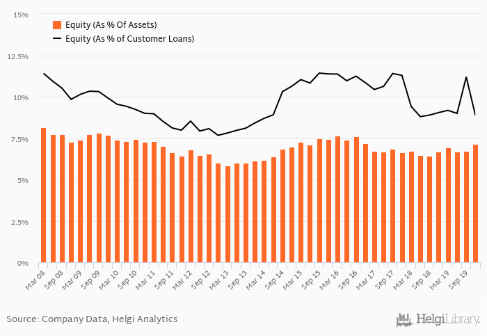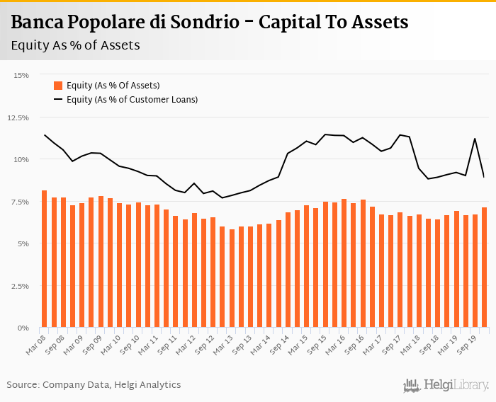 Banca Popolare di Sondrio's Equity reached 7.14% of total assets in the 4Q2019, up from 6.67% for the previous year. As a share of net customer loans, the ratio amounted to 8.86% at the end of the fourth quarter of 2019.