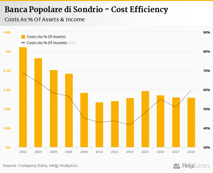 Banca Popolare di Sondrio's cost to income ratio reached 59.6% in 2018, up from 50.8% compared to the previous year.