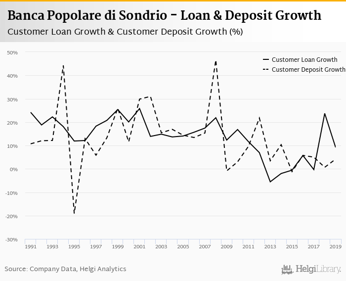 Banca Popolare di Sondrio's customer loan growth reached 9.17% in 2019, down from 23.7% compared to the previous year. Historically, the bank’s loans growth reached an all time high of 25.8% in 2001 and an all time low of -5.55% in 2013. In the last decade, the average annual loan growth amounted to 6.20%.