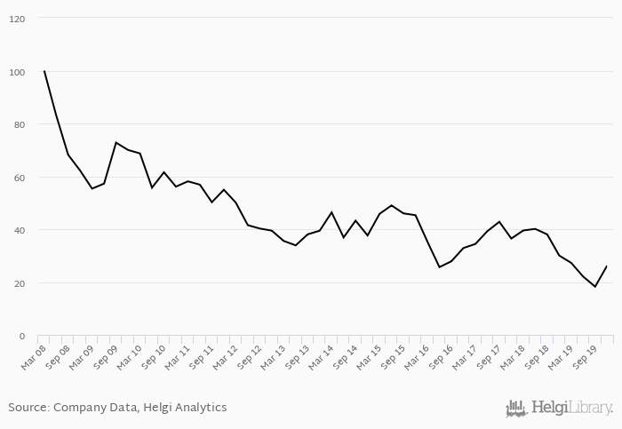 Over the last five years, the stock has depreciated by 31.9 implying an annual average growth of -7.40% In absolute terms, the value of the company fell by USD -516 mil.