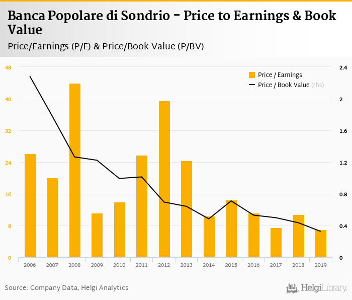 At the end of 2019, the bank traded at price to earnings of 6.95x. Within the last five years, the multiple reached an all time high of 14.4x in 2015 and an all time low of 6.95x in 2019 with an average of 10.2x.