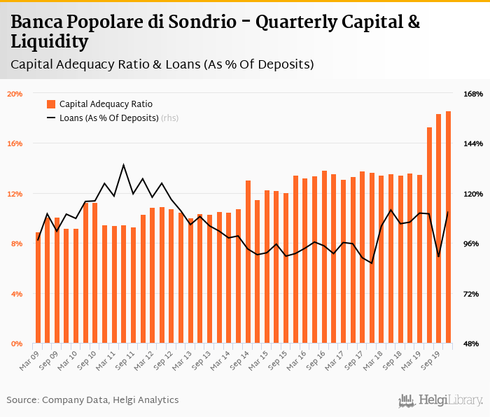 Banca Popolare di Sondrio's capital adequacy ratio reached 18.6% at the end of fourth quarter of 2019, up from 18.4% when compared to the previous quarter. Historically, the bank’s capital ratio hit an all time high of 18.6% in 4Q2019 and an all time low of 8.93% in 1Q2009.