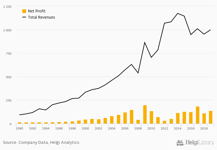On the other hand, bank’s revenues amounted to an all time high of EUR 1,174 mil in 2014 and an all time low of EUR 93.4 mil in 1990. The average revenues in the last five years reached EUR 1,011 mil.