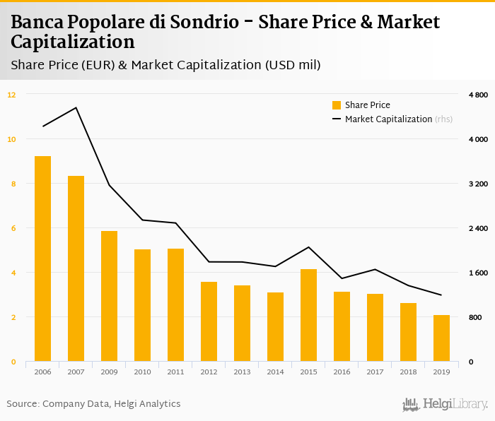 Banca Popolare di Sondrio stock traded at EUR 2.11 per share at the end of 2019 implying a market capitalization of USD 1,183 mil.
