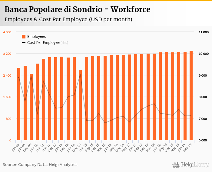 Banca Popolare di Sondrio employed 3,305 persons in 2019-09-30, up 1.32% when compared to the previous year. Historically, the bank's workforce hit an all time high of 3,305 persons in 2019-09-30 and an all time low of 2,454 in 2009-12-31.