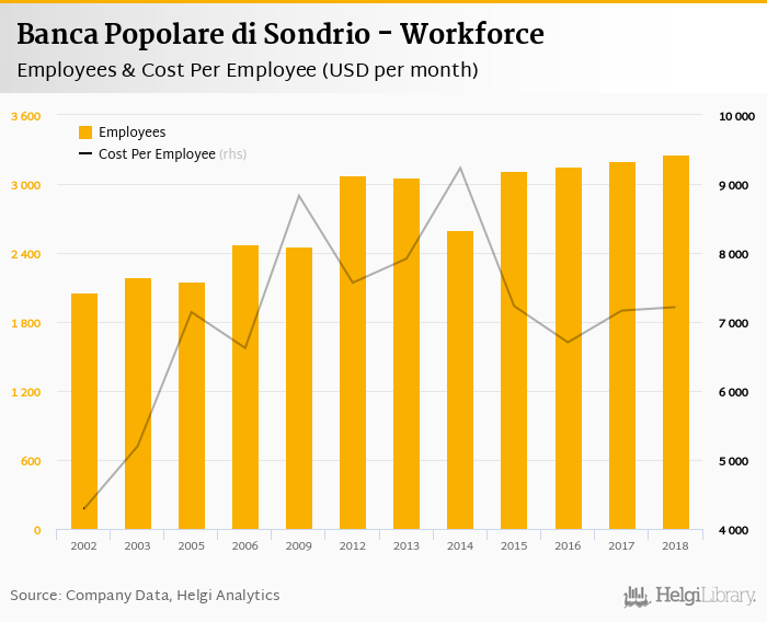 Banca Popolare di Sondrio employed 3,254 persons in 2018, up 1.62% when compared to the previous year. Historically, the bank's workforce hit an all time high of 3,254 persons in 2018 and an all time low of 2,061 in 2002.