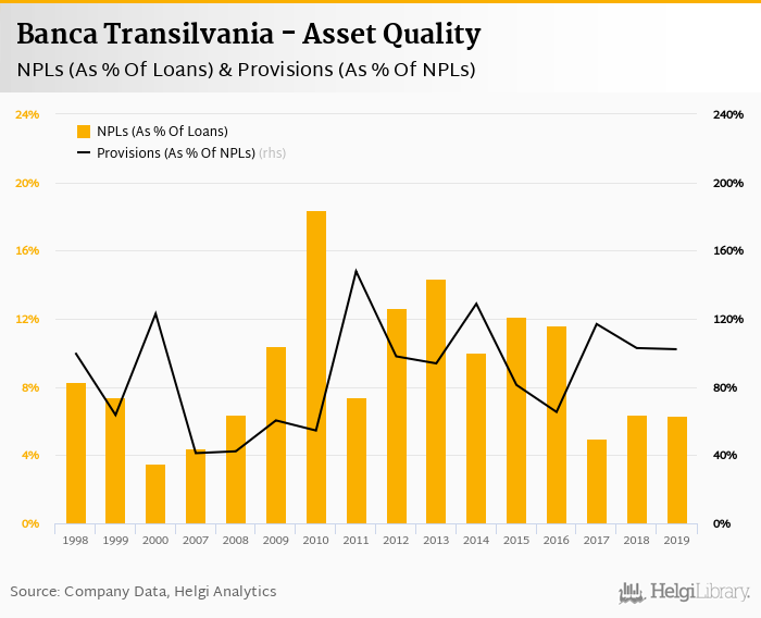 Banca Transilvania's non-performing loans reached 6.31% of total loans at the end of 2019, down from 6.39% compared to the previous year. Historically, the NPL ratio hit an all time high of 18.4% in 2010 and an all time low of 3.53% in 2000.