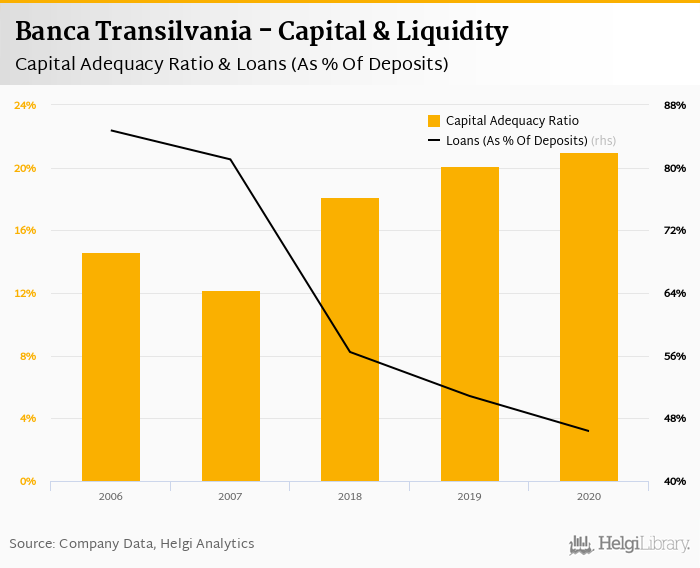 Banca Transilvania's capital adequacy ratio reached 21.0% at the end of 2020, up from 20.1% compared to the previous year. Historically, the bank’s capital ratio hit an all time high of 21.0% in 2020 and an all time low of 12.2% in 2007.