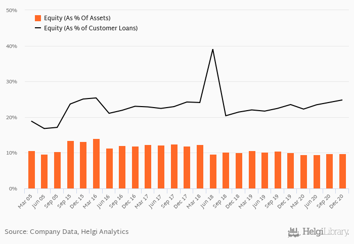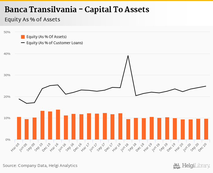 Banca Transilvania's Equity reached 9.73% of total assets in the 4Q2020, down from 10.0% for the previous year. As a share of net customer loans, the ratio amounted to 24.8% at the end of the fourth quarter of 2020.