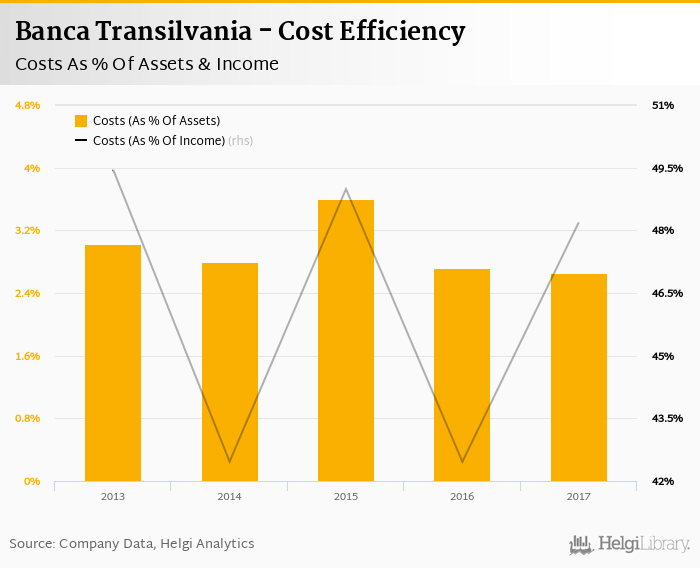 Comparing Banca Transilvania with its closest peers, BRD Groupe Societe Generale operated in 2017 with a cost to income ratio of 53.1% in 2017, and Raiffeisen Bank Romania reached 60.4%.