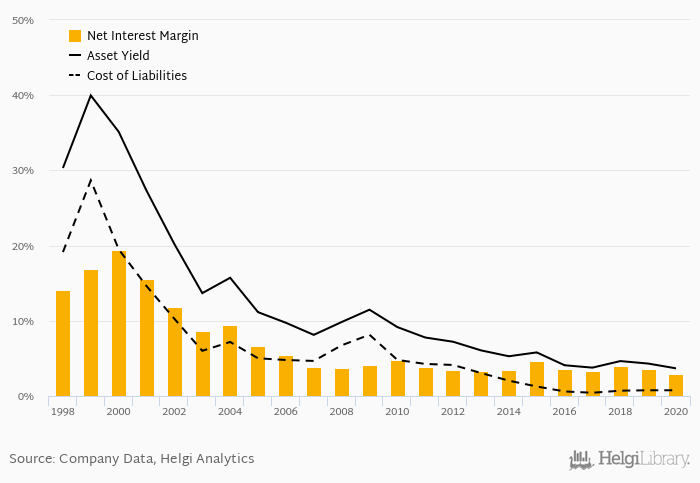 Historically, the bank’s net interest margin reached an all time high of 19.5% in 2000 and an all time low of 2.99% in 2020. The average margin in the last five years amounted to 3.52%.