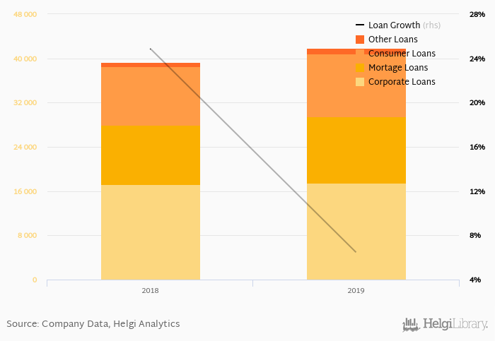 Mortgage loans represented 28.8% of the bank's loan book at the end of the year 2019, consumer further 26.9% and corporate loans 41.8% of total loans.
