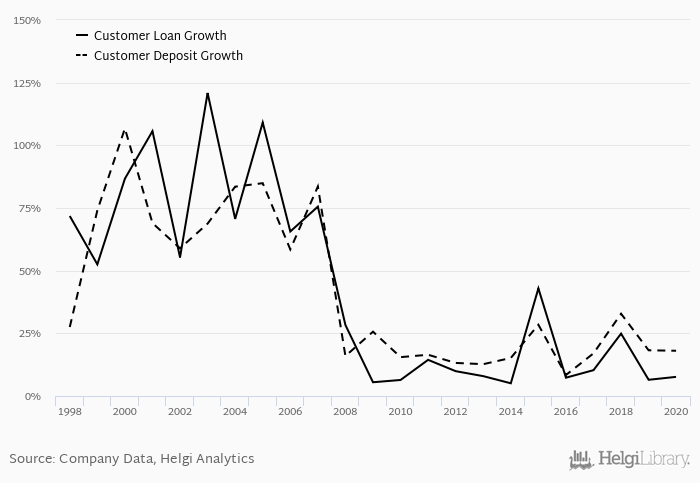 On the other hand, bank's customer deposit growth amounted to 18.1% at the end of 2020, down from 18.2% when compared to the previous year. Historically, the bank’s deposit growth reached an all time high of 107% in 2000 and an all time low of 8.37% in 2016. In the last decade, the average annual loan growth amounted to 17.8%.