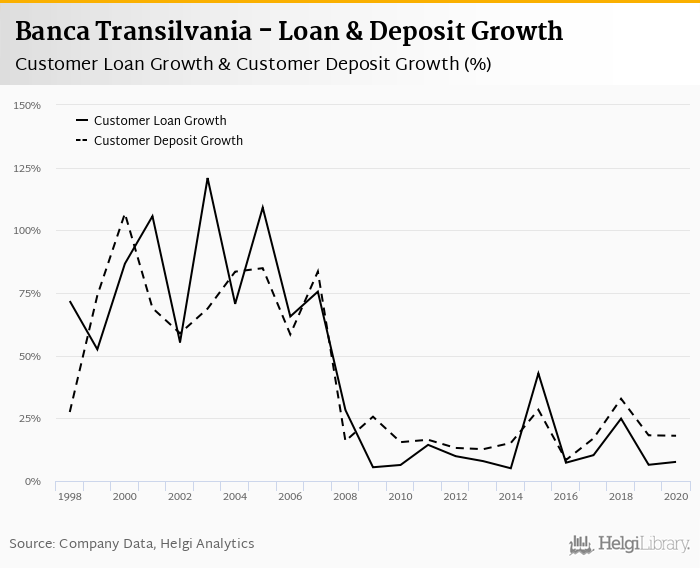 Banca Transilvania's customer loan growth reached 7.63% in 2020, up from 6.47% compared to the previous year. Historically, the bank’s loans growth reached an all time high of 121% in 2003 and an all time low of 5.07% in 2014. In the last decade, the average annual loan growth amounted to 13.2%.