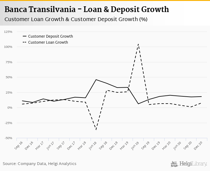 Banca Transilvania's customer loan growth reached 7.63% in 2020-12-31, up from 6.47% compared to the previous year. Historically, the bank’s loans growth reached an all time high of 104% in 2019-06-30 and an all time low of -35.9% in 2018-06-30. In the last decade, the average annual loan growth amounted to 0%.