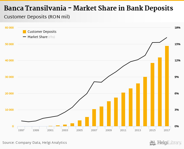 Banca Transilvania accounted for 16.2% of all customer deposits taken by banks in Romania at the end of 2017. Historically, the bank’s market share in customer deposits reached an all time high of 16.2% in 2017 and an all time low of 0.802% in 1998.