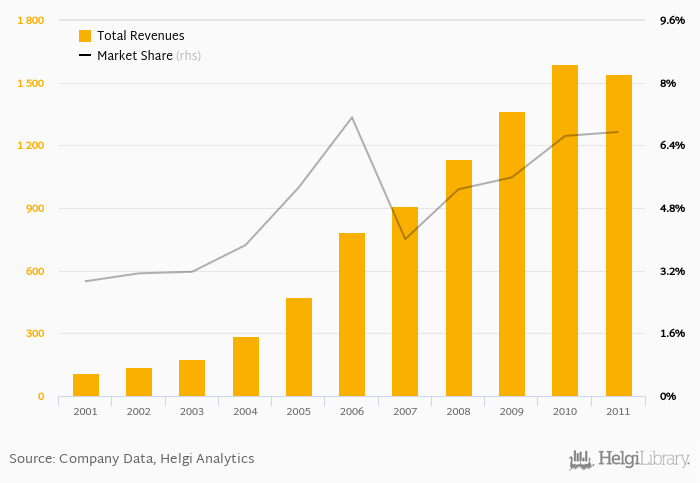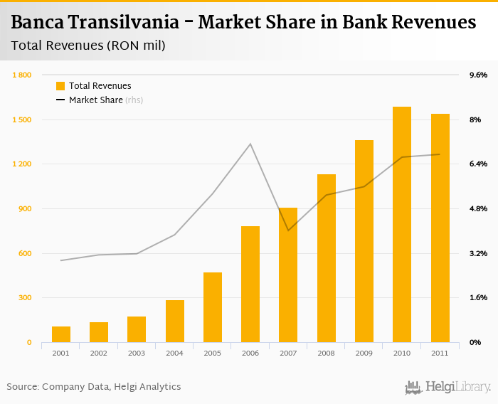As a result, Banca Transilvania accounted for 6.74% of all bank revenues generated by banks in Romania in 2011. Historically, the bank’s market share in total revenues reached an all time high of 7.11% in 2006 and an all time low of 2.93% in 2001.
