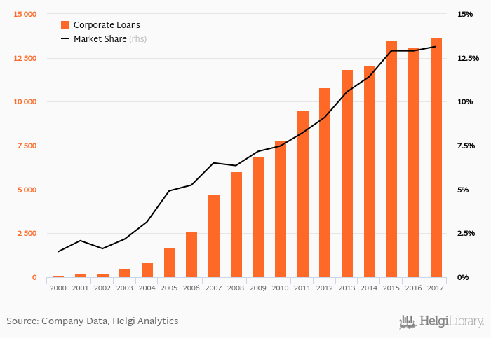 Banca Transilvania accounted for 13.1% of all corporate loans issued in Romania at the end of 2017. Historically, the bank’s market share in corporate loans reached an all time high of 13.1% in 2017 and an all time low of 1.45% in 2000.