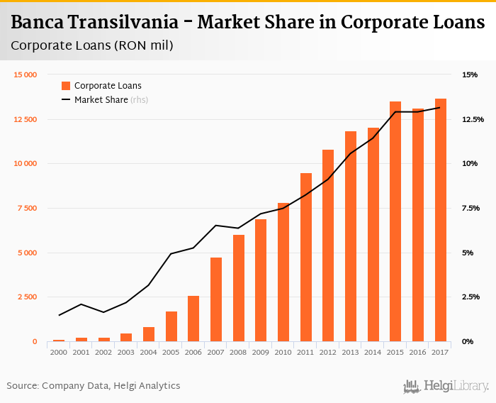 Banca Transilvania's corporate loans reached RON 13,693 mil in 2017, up 4.45% compared to the previous year.