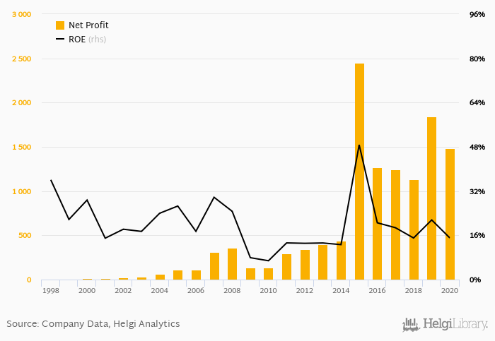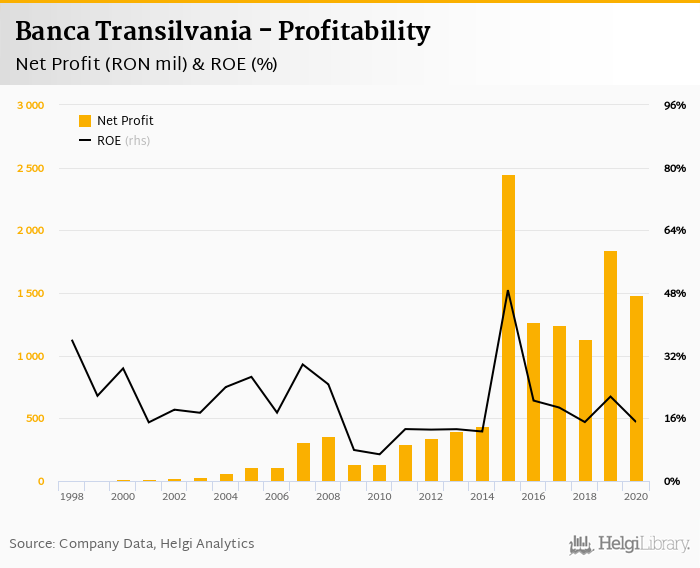 Banca Transilvania made a net profit of RON 1,481 mil in 2020, down 19.7% compared to the previous year. This implies a return on equity of 15.0%.