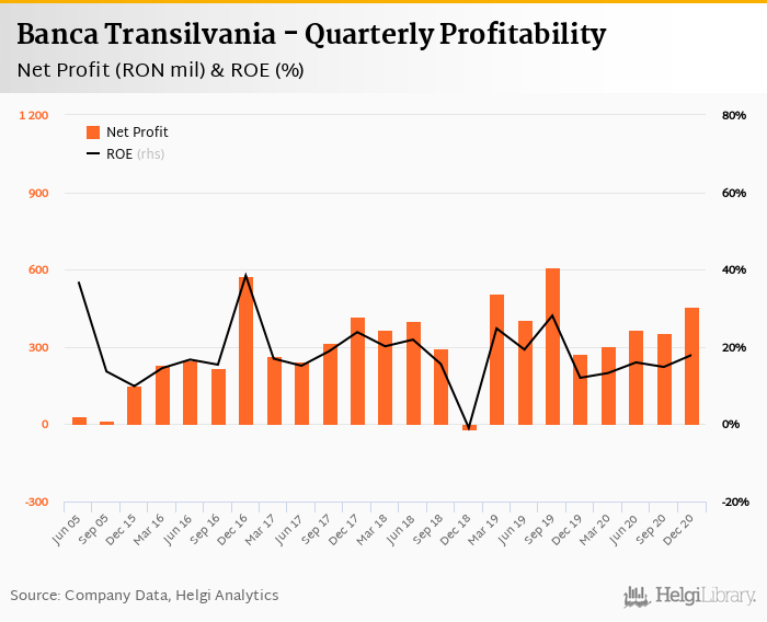 Banca Transilvania made a net profit of RON 454 mil in the fourth quarter of 2020, up 65.7% when compared to the same period of last year. This implies a return on equity of 17.9%.