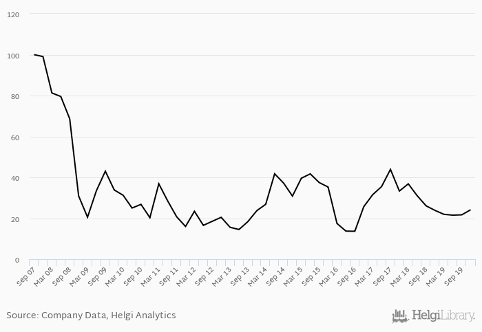 Over the last five years, the stock has depreciated by 72.8 implying an annual average growth of -22.9% In absolute terms, the value of the company fell by USD -957 mil.
