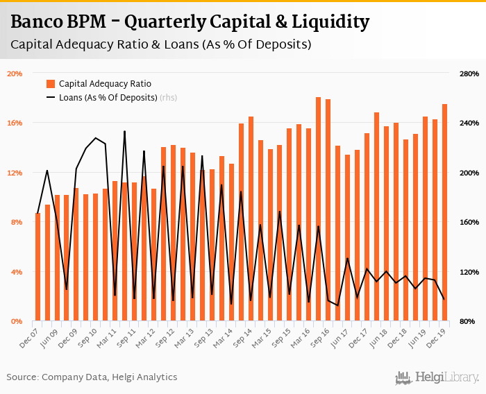 Banco BPM's capital adequacy ratio reached 17.5% at the end of fourth quarter of 2019, up from 16.3% when compared to the previous quarter. Historically, the bank’s capital ratio hit an all time high of 18.1% in 2Q2016 and an all time low of 8.73% in 4Q2007.