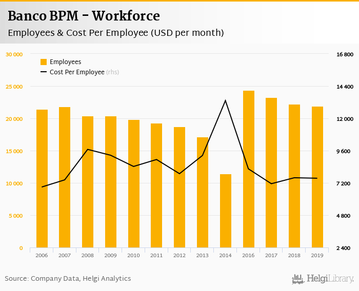 Banco BPM employed 21,941 persons in 2019, down 1.38% when compared to the previous year. Historically, the bank's workforce hit an all time high of 24,330 persons in 2016 and an all time low of 11,441 in 2014.