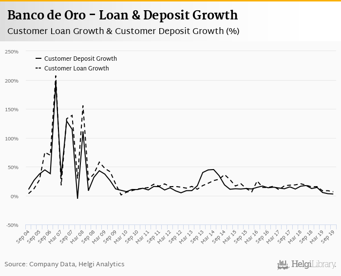 Banco de Oro's customer loan growth reached 6.58% in 2019-09-30, down from 15.1% compared to the previous year. Historically, the bank’s loans growth reached an all time high of 207% in 2006-12-31 and an all time low of 1.13% in 2009-12-31. In the last decade, the average annual loan growth amounted to 16.0%.