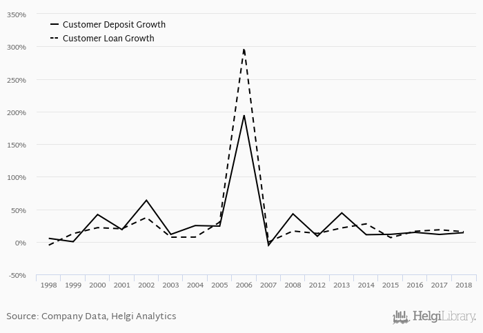 On the other hand, bank's customer deposit growth amounted to 14.1% at the end of 2018, up from 11.3% when compared to the previous year. Historically, the bank’s deposit growth reached an all time high of 194% in 2006 and an all time low of -5.25% in 2007. In the last decade, the average annual loan growth amounted to 14.3%.