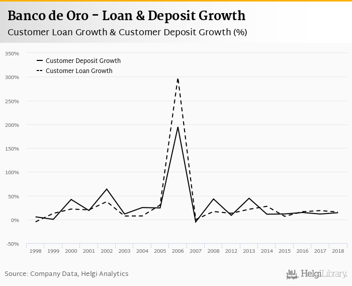 Banco de Oro's customer loan growth reached 15.6% in 2018, down from 18.5% compared to the previous year. Historically, the bank’s loans growth reached an all time high of 298% in 2006 and an all time low of -5.10% in 1998. In the last decade, the average annual loan growth amounted to 18.6%.