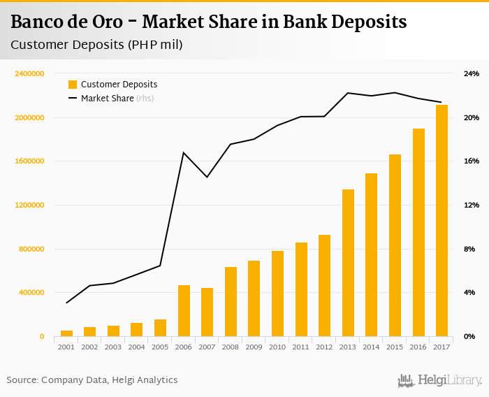 Banco de Oro accounted for 21.4% of all customer deposits taken by banks in Philippines at the end of 2017. Historically, the bank’s market share in customer deposits reached an all time high of 22.2% in 2015 and an all time low of 3.02% in 2001.