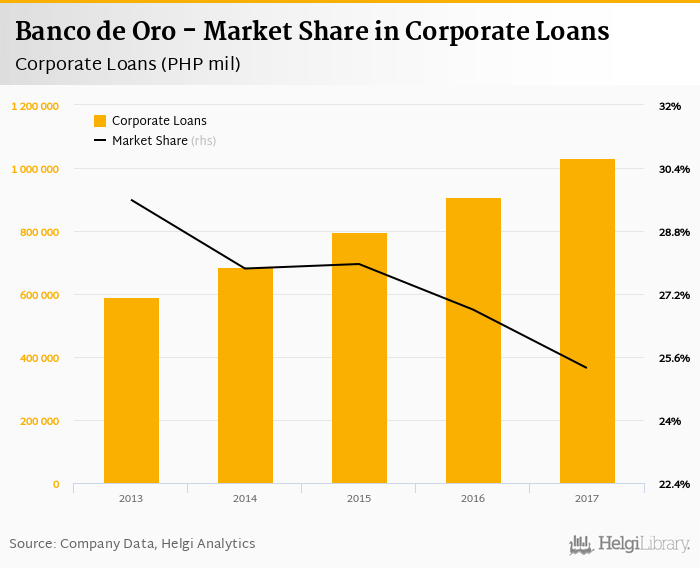 Banco de Oro accounted for 25.3% of all corporate loans issued in Philippines at the end of 2017. Historically, the bank’s market share in corporate loans reached an all time high of 29.6% in 2013 and an all time low of 25.3% in 2017.