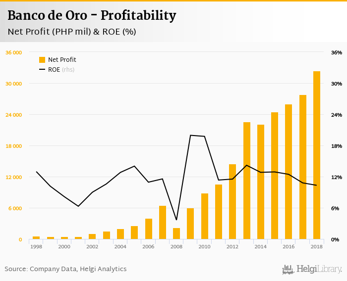 Banco de Oro made a net profit of PHP 32,348 mil in 2018, up 16.2% compared to the previous year. This implies a return on equity of 10.3%.