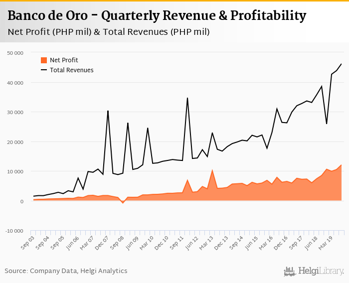 Banco de Oro made a net profit of PHP 12,045 mil under revenues of PHP 46,149 mil in the third quarter of 2019, up 42.6% and 19.9% respectively when compared to the same period last year.
