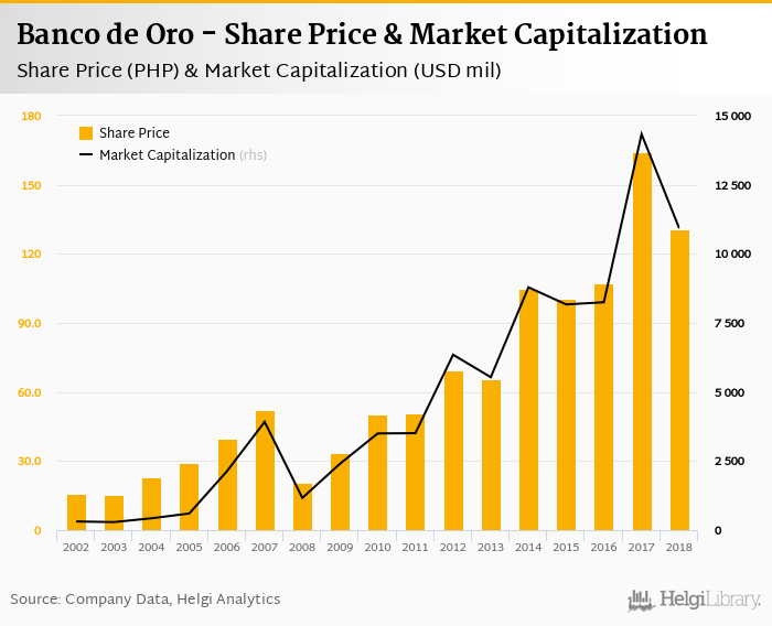 Banco de Oro stock traded at PHP 131 per share at the end of 2018 implying a market capitalization of USD 10,924 mil.