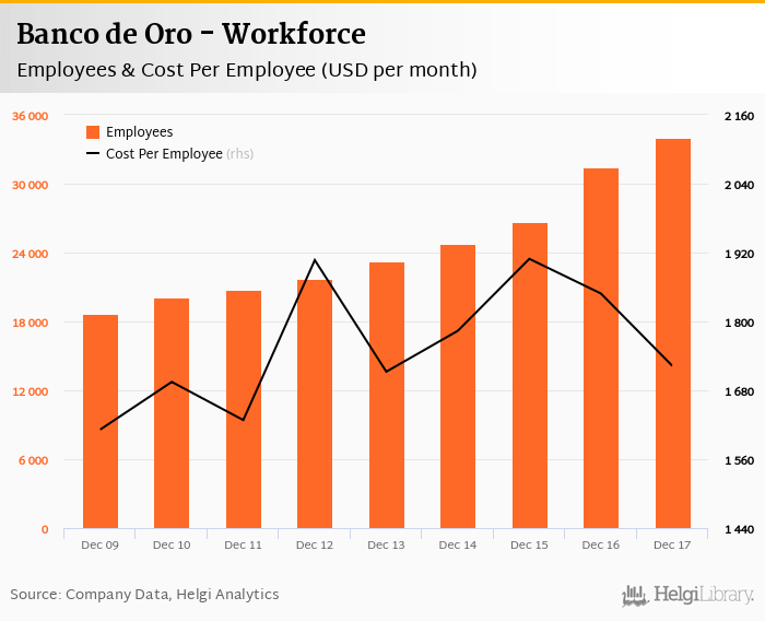 Banco de Oro employed 34,000 persons in 2017-12-31, down 0% when compared to the previous year. Historically, the bank's workforce hit an all time high of 34,000 persons in 2017-12-31 and an all time low of 18,643 in 2009-12-31.