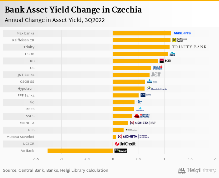 In terms of momentum, Max banka increased its asset yield the most in the last 12 months, by 1.14 bp to 6.10%, followed by Raiffeisenbank Czech Republic (up by 1.12 bp) and Trinity Bank (up by 1.10 bp).
