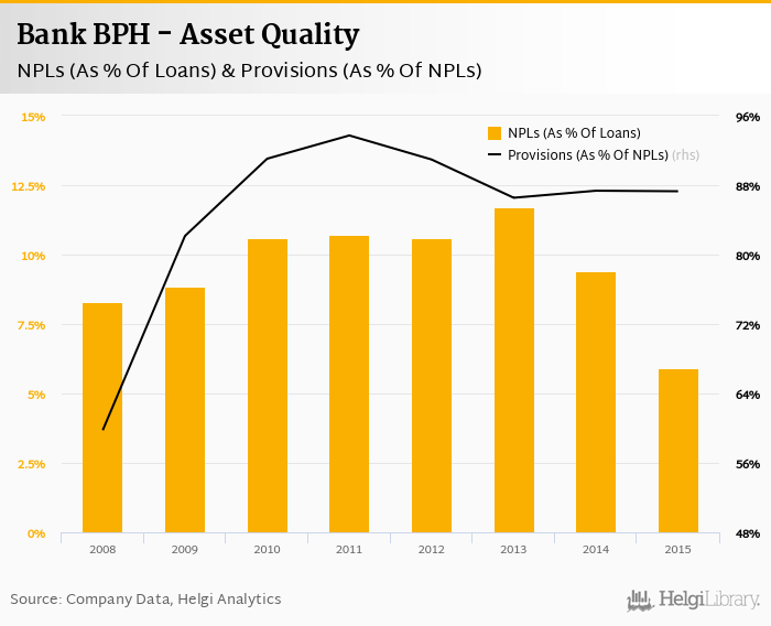 Bank BPH's non-performing loans reached 5.90% of total loans at the end of 2015, down from 9.40% compared to the previous year. Historically, the NPL ratio hit an all time high of 11.7% in 2013 and an all time low of 5.90% in 2015.