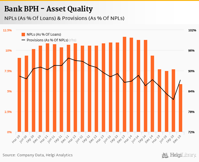 Comparing Bank BPH with its closest peers, PKO BP operated at the end of 2015-12-31 with NPL ratio of 6.59% and provision coverage of 63.3%, Pekao SA with 6.53% and 71.9% respectively and ING Bank Slaski had 3.42% of bad loans covered with 68.1% by provisions at the end of 2015-12-31.