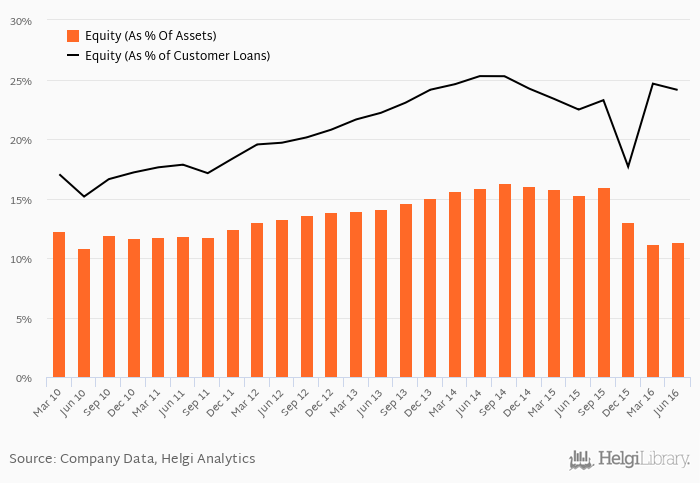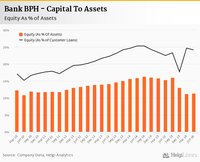 Bank BPH's Equity reached 6.86% of total assets in the 2Q2016, down from 7.85% for the previous year. As a share of net customer loans, the ratio amounted to 10.2% at the end of the second quarter of 2016.