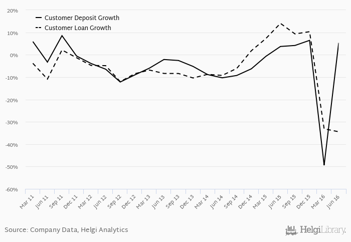 On the other hand, bank's customer deposit growth amounted to 5.31% at the end of 2016-06-30, up from 3.69% when compared to the previous year. Historically, the bank’s deposit growth reached an all time high of 8.52% in 2011-09-30 and an all time low of -49.4% in 2016-03-31. In the last decade, the average annual loan growth amounted to 0%.