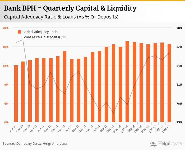 Bank BPH's capital adequacy ratio reached 16.6% at the end of fourth quarter of 2015, down from 16.9% when compared to the previous quarter. Historically, the bank’s capital ratio hit an all time high of 17.2% in 2Q2014 and an all time low of 12.1% in 2Q2010.