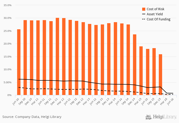 Historically, the bank’s cost of risk reached an all time high of 30.2% in 4Q2011 and an all time low of 0.125% in 2Q2016. The average cost of risk in the last six quarters amounted to 12.0%.