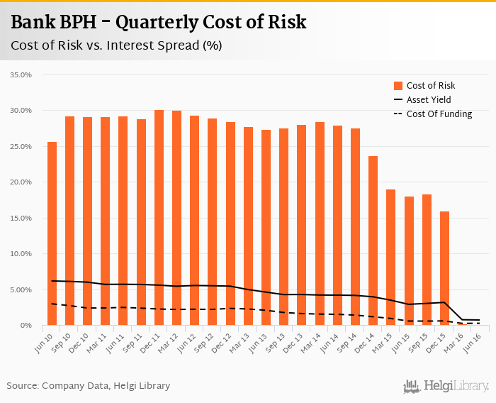 Bank BPH's Cost of Risk (loan loss provisions as % of total assets) amounted to 0.125% in the second quarter of 2016, down from 0.158% when compared to the previous quarter.
