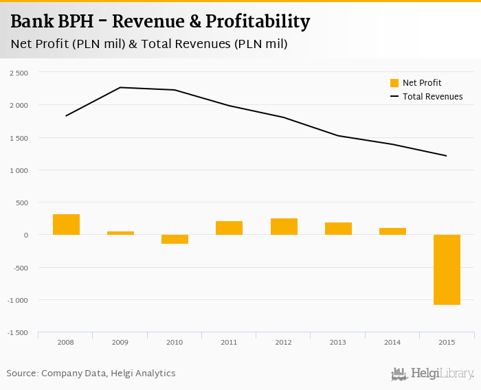 Bank BPH made a net profit of PLN -1,072 mil under revenues of PLN 1,208 mil in 2015, up -1059% and -12.9% respectively compared to the previous year.