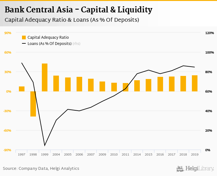 Bank Central Asia's capital adequacy ratio reached 24.6% at the end of 2019, up from 24.0% compared to the previous year. Historically, the bank’s capital ratio hit an all time high of 42.9% in 1999 and an all time low of -38.7% in 1998.